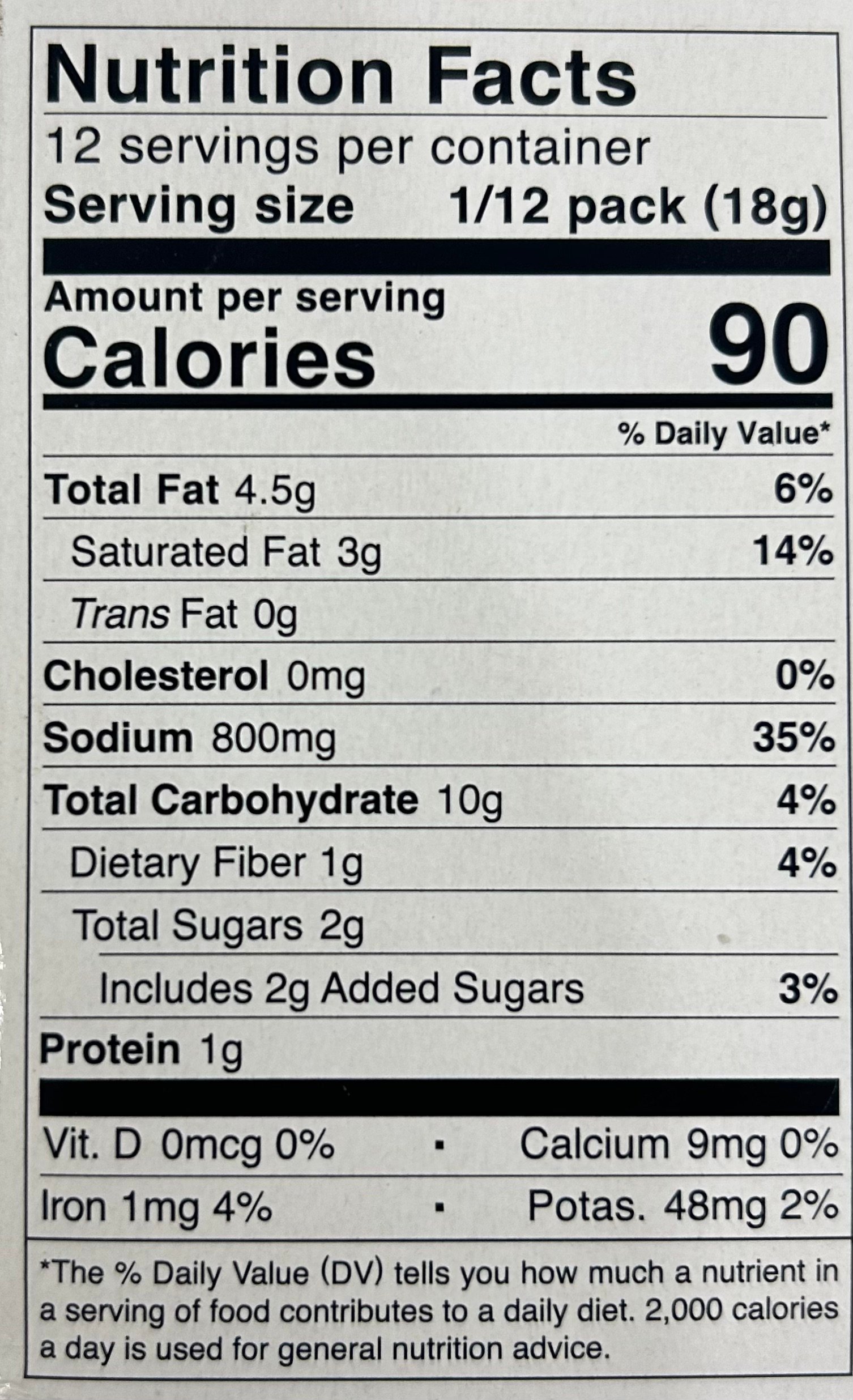 | Ingredients | Wheat Flour, Vegetable Oils (Palm Oil, Rapeseed Oil), Sugar, Salt, Curry Powder, Monosodium Glutamate, Caramel Color, Spices (Pepper, Chili Pepper, Garlic, Celery Seed, Mustard), Malic Acid, Disodium Inosinate, Disodium Guanylate |