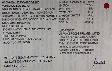 Nutrition(per 100ml) : Marutomo Kombu Katsuo Tsuyu is low in fat and calories, with 72 kcal and 0.5g fat per 100ml. It contains 15g carbs, 3g protein, and is rich in umami. High in sodium (9.6g), so best used diluted.