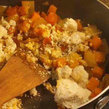 Then add the turmeric powder, carrots and stir fry for a further minute then add 300cc of water. - Cover and simmer until the vegetables are soft (about 10 minutes).Add the soy pulp and salt and cook while stirring.