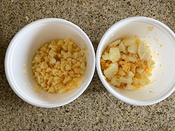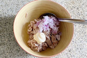 - Drain the canned tuna, add onion and 1 tablespoon mayonnaise and mix.